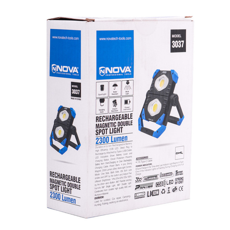 برای انتخاب و خرید یک نورافکن شارژی باکیفیت و با دوام شما بایستی به مشخصات باتری آن ، شدت روشنایی ، میزان نوردهی و قابلیت حمل آن که از مهمترین عوامل یک محصول باکیفیت به شمار می رود، توجه کنید. جهت انجام فعالیت هایی مانند طبیعت گردی ، پیاده روی در فضای تاریک ، تعمیرگاه خودرو و به طور کلی روشنایی بخشیدن به فضاهای تاریک ، نیاز به یک نورافکن کارامد همیشه وجود دارد. با نورافکن کتابی شارژی 2300 لومن نووا ، می توانید نور کافی را جهت انجام فعالیت در محیط های تاریک فراهم نمایید. این محصول پرکاربرد ، دارای دو عدد LED COB حرفه ای 20 وات با راندمان بالا و توان روشنایی حداکثر 2300 لومن است و منبع تغذیه آن ، باتری پر قدرت لیتیومی 3/7 ولتی 5000 میلی آمپر بوده که در حالت پرنور، به مدت 3.5 ساعت محیط اطراف شما را تا طول 30 متر روشنایی می بخشد. این نورافکن با طراحی فشرده و قابل حمل، مناسب برای استفاده در محیط های کاری، کمپینگ، تعمیرات خودرو، و مواقع اضطراری است و با توجه به نیاز به روشنایی قابل اطمینان در فضاهای مختلف، این محصول میتواند نیازهای کاربران حرفهای و خانگی را به خوبی برآورده کند.